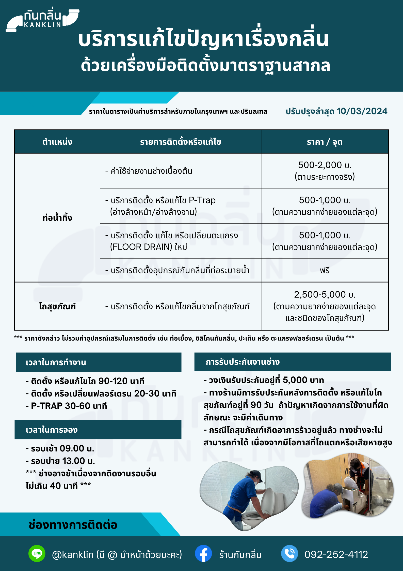 >> คำนวณค่าใช้จ่ายได้ดังนี้ ค่าบริการงานช่างตามระยะจากร้านถึงคอนโด 1,500 บาท + ค่าอุปกรณ์กันกลิ่น  799 บาท (อุปกรณ์สำหรับท่อส่วนอาบน้ำ 250 บ. อุปกรณ์สำหรับส่วนแห้ง 250 บ. อุปกรณ์ติดอ่างล้างหน้า 175 บ. และจุดที่เครื่องซักผ้า 250 บ.) โดยที่อุปกรณ์กันกลิ่นที่ใช้เป็นรุ่นซิลิโคนทั้งหมด กรณีที่รูระบายน้ำมีขนาดเล็กมากต้องใช้เครื่องมือพิเศษเพื่อขยายรูระบายน้ำ (กระเบื้องไม่เสียหาย) คิดราคาต่อจุด 350 บาท